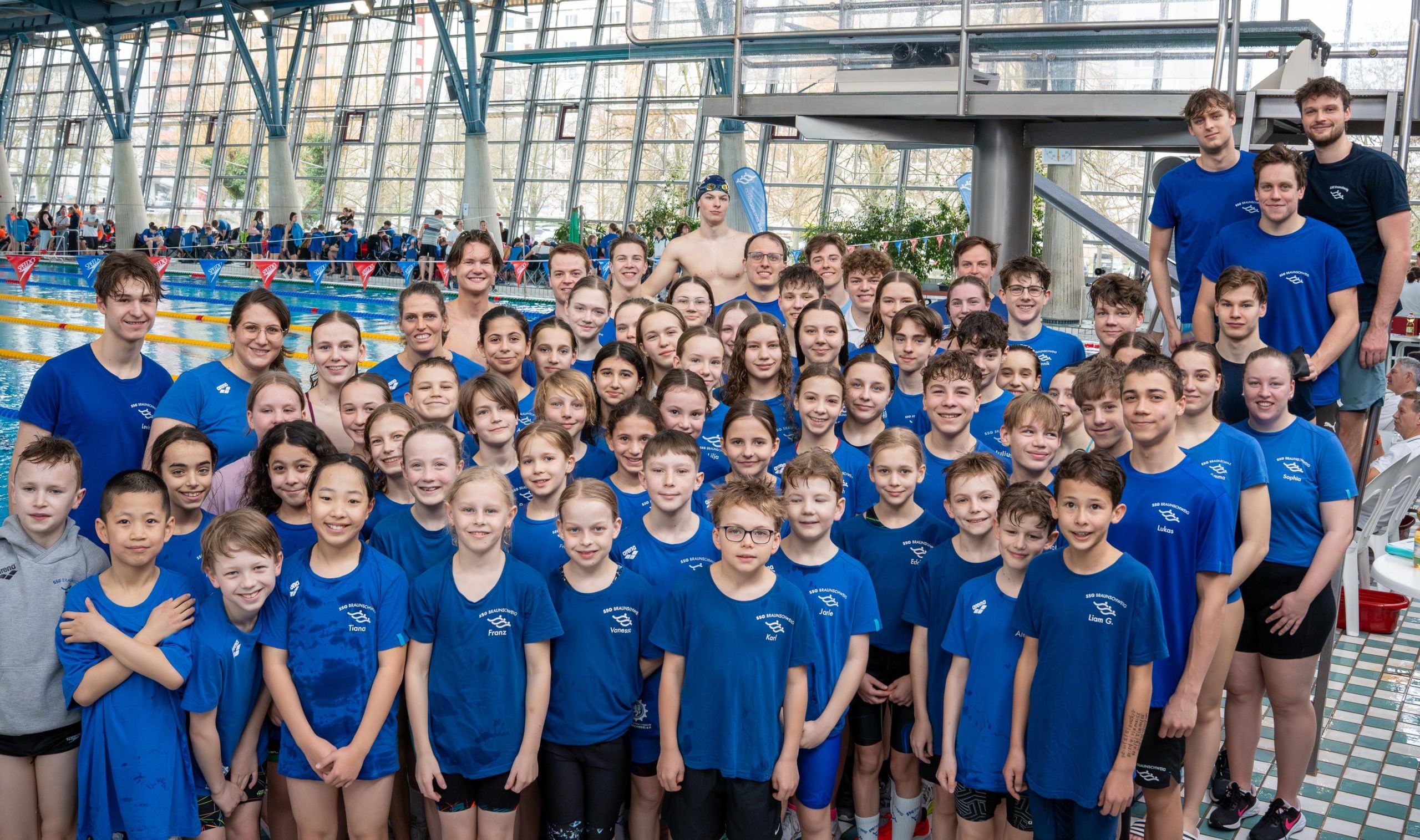 Am Wochenende des 14./15.03.2026 fanden in unserem Heidbergbad die Bezirksmeisterschaften auf der Langbahn statt. Zahlreiche Helfer begannen schon am Freitag damit, die Halle vorzubereiten, bevor der Wettkampf am Samstag um 12:00 Uhr starten konnte. Unsere Schwimmer*innen der SSG waren mit 83 Teilnehmer*innen am stärksten vertreten und konnten sich auf allen Strecken bis 400 m Freistil die Bezirksmeistertitel sichern.